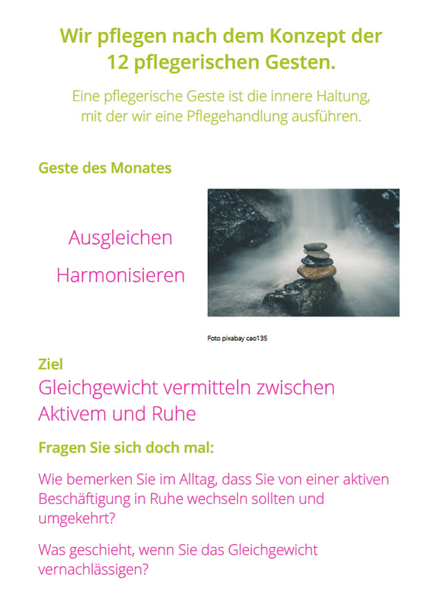 Wir beziehen die Gesten in unsere Pflegeplanung ein und passen sie in regelmäßigen Abständen an die aktuelle Situation an.